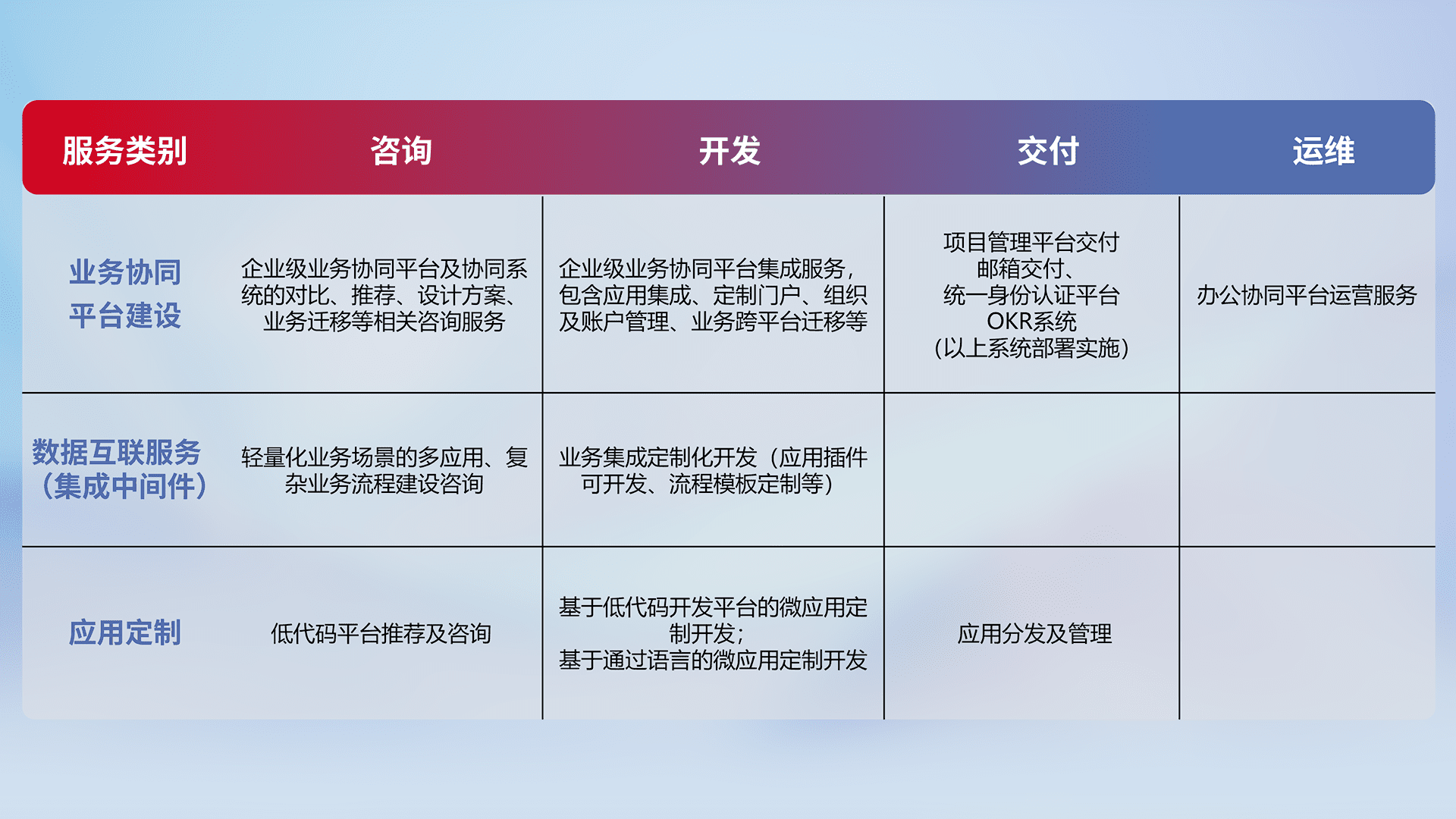 针对钉钉、、、、企微、、、、IDaas等平台级产品提供产品的规划、、、方案、、、、交付、、定制化开发等服务,,实现如统一协同办公、、、智能客户服务、、混合会议管理、、、智能数据查询、、、等业务场景,,,,实现数字化转型。。